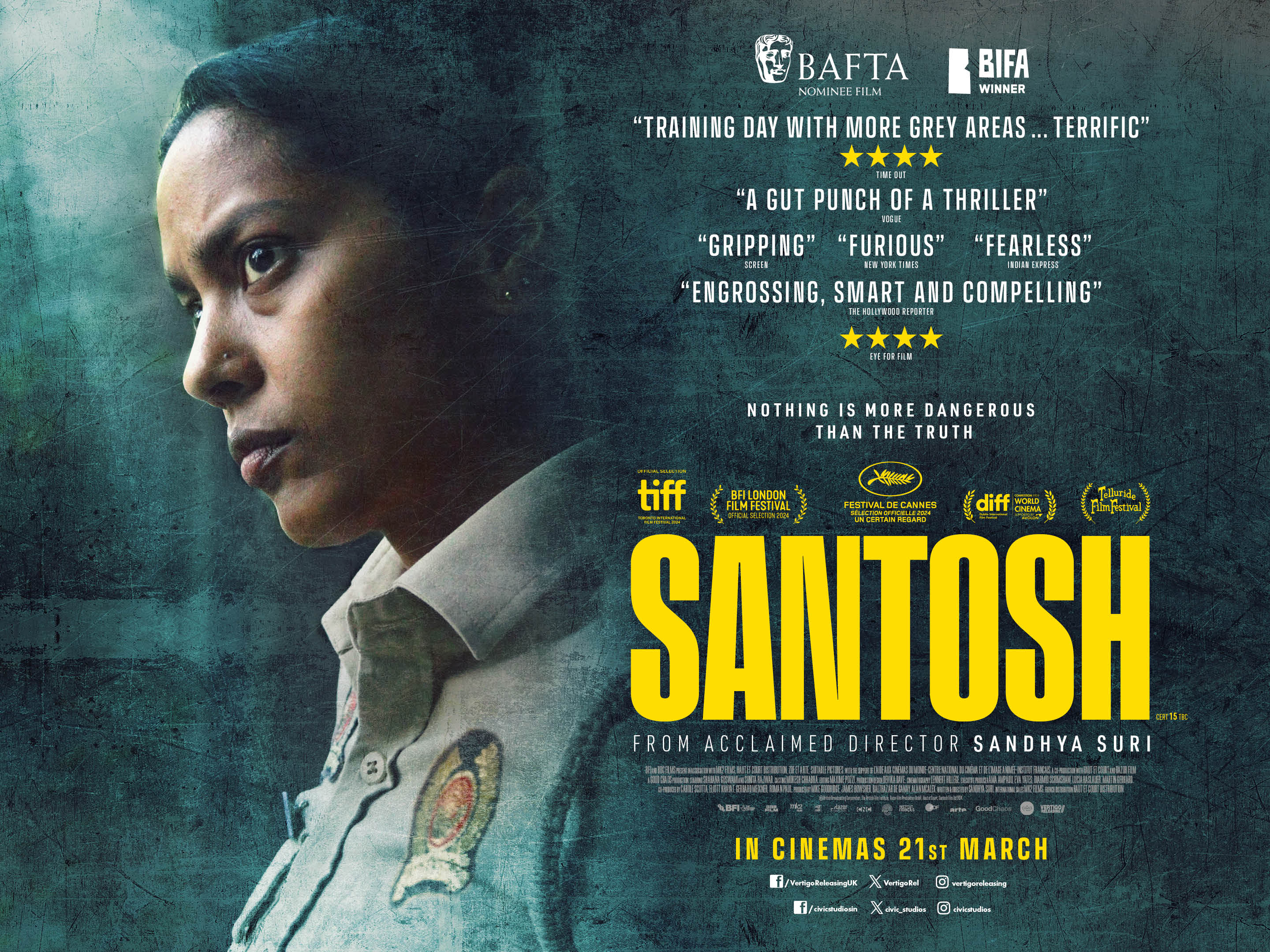 This feature debut from the British-Indian filmmaker Sandhya Suri is a sharp, probing study of police corruption and deep-rooted social tensions in modern India. Led by an impressively restrained and nuanced central performance from Sahana Goswami, Santosh boldly sets itself apart from other police procedurals through its richly-drawn setting, themes and characters.